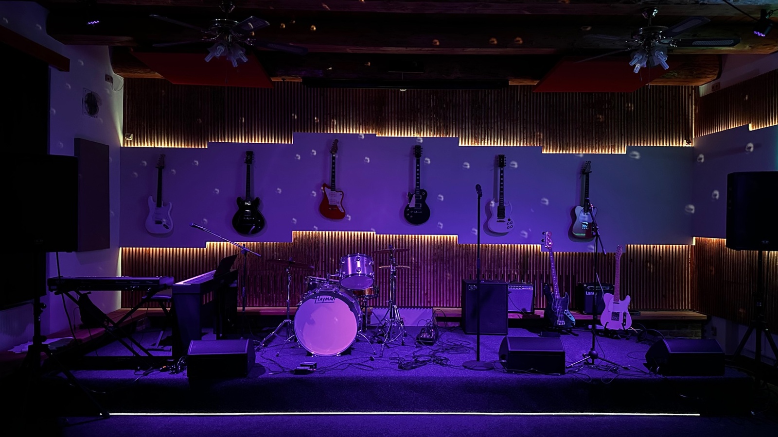 The venue includes a music hall with a stage, as well as a bar and wine bar, which allow for convenient refreshments for guests.
