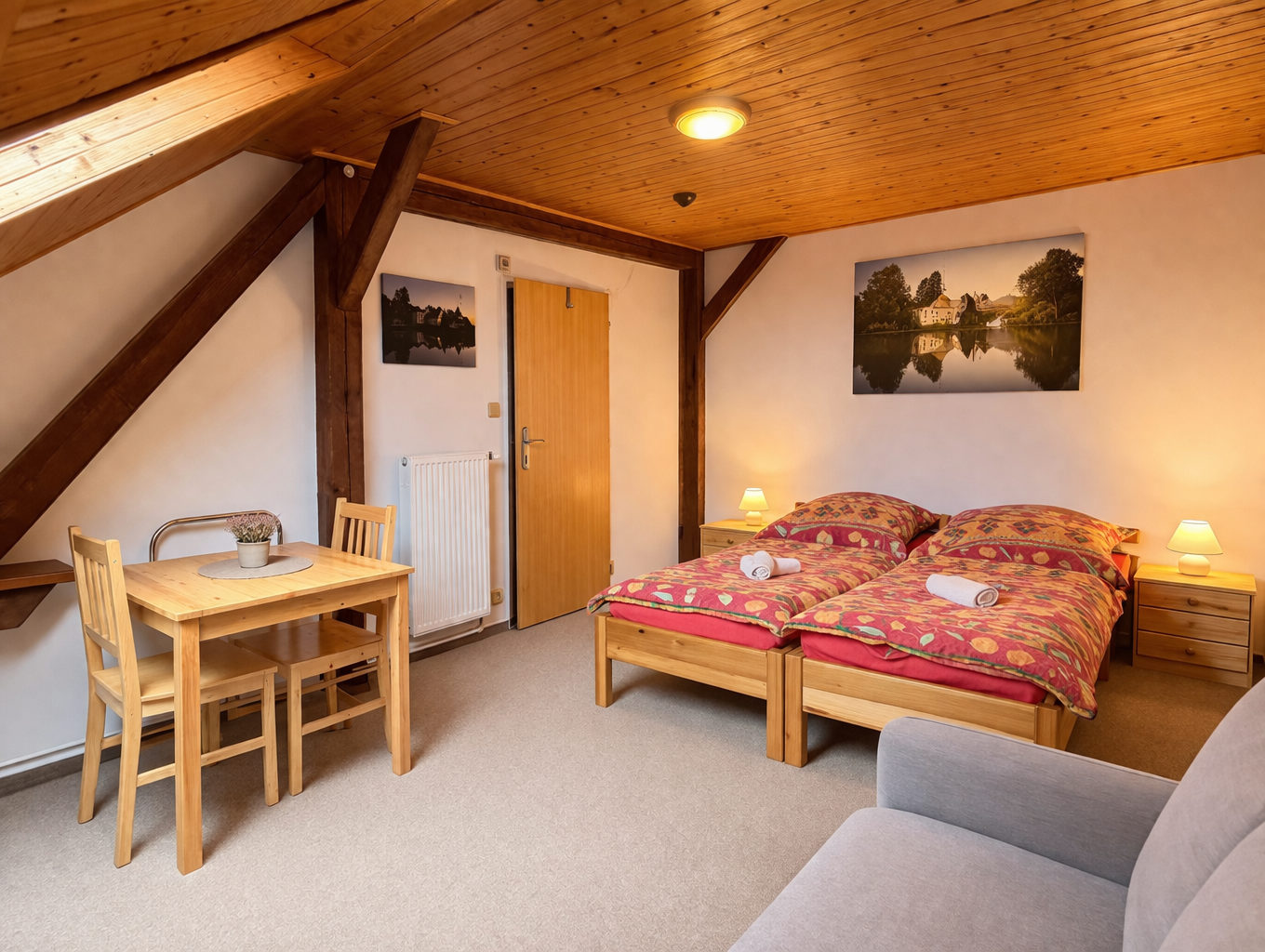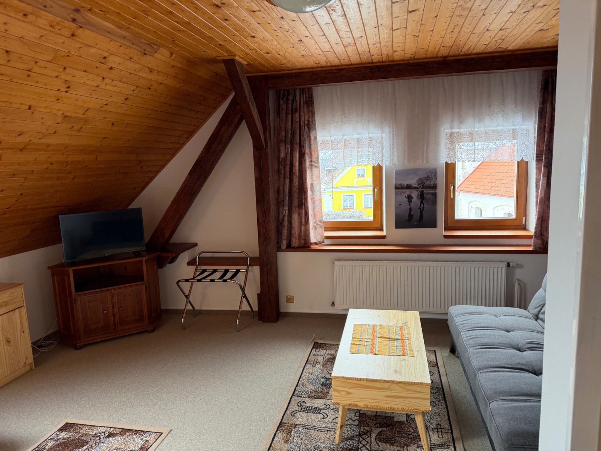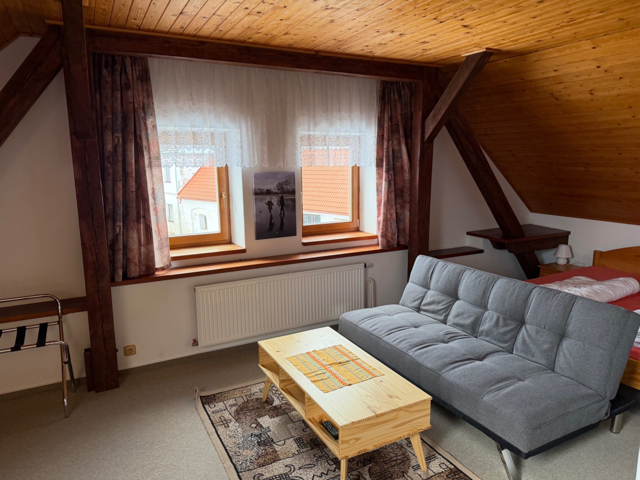 Velkou předností jsou také krásné výhledy. Ze dvou oken se otevírá pohled na historickou náves, zatímco střešní okno směřuje na rybník. Právě spojení pohodlí, prostoru a jedinečných výhledů dělá z tohoto pokoje jedno z nejpříjemnějších míst k ubytování v penzionu.