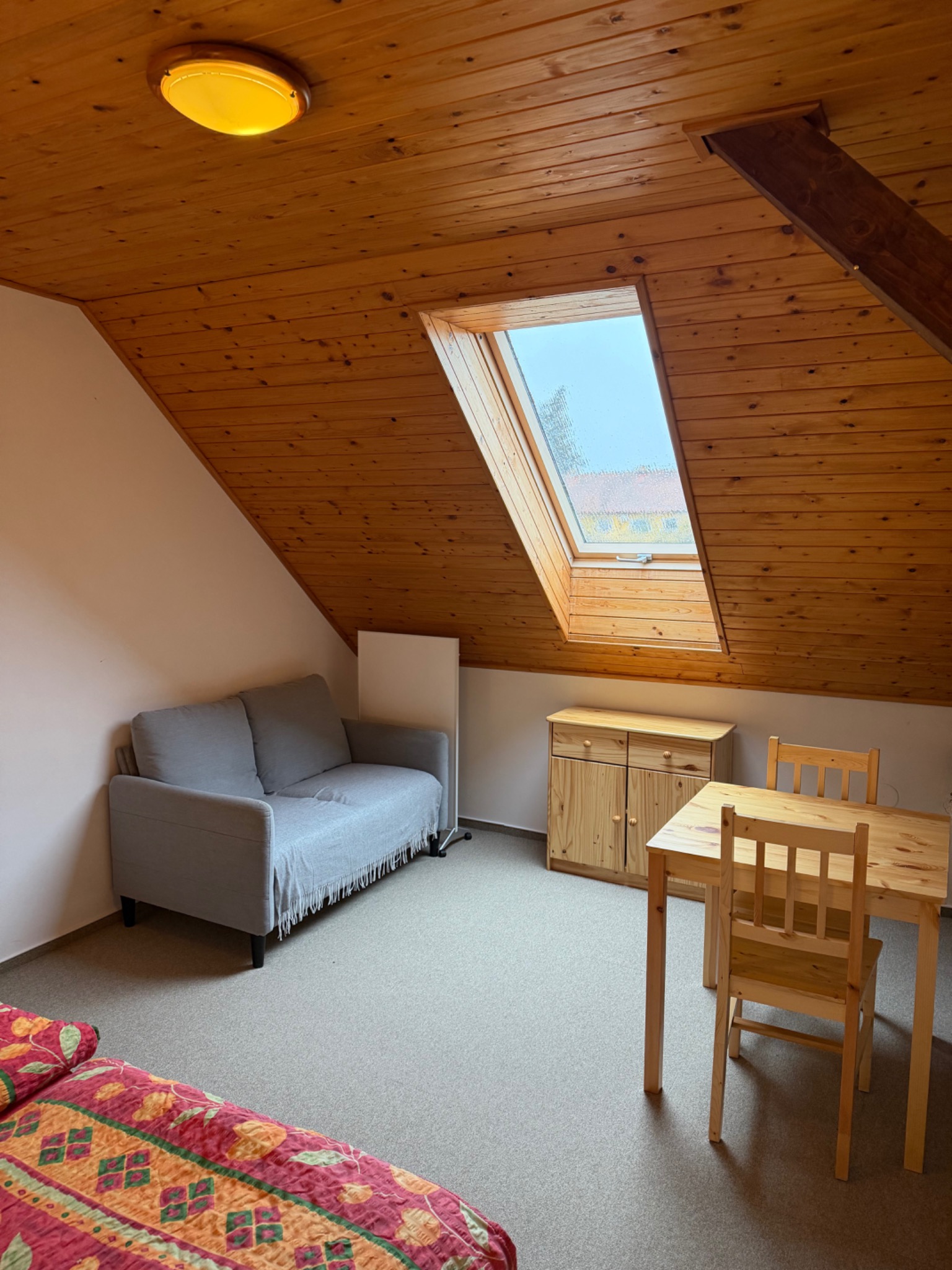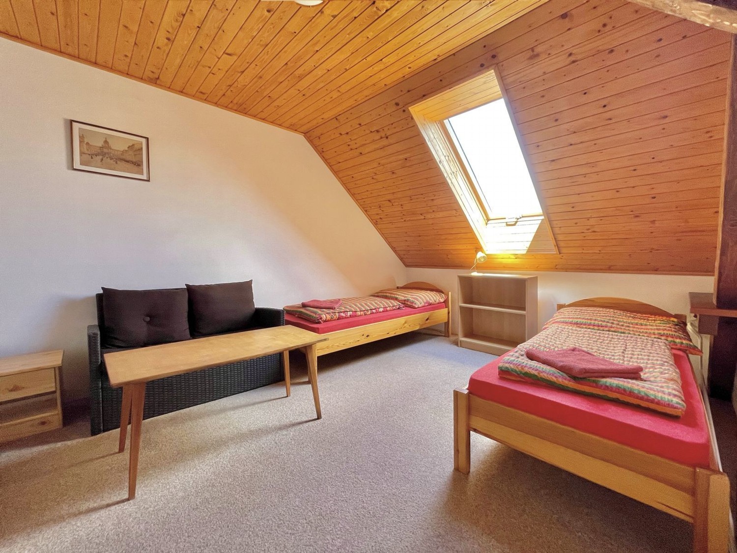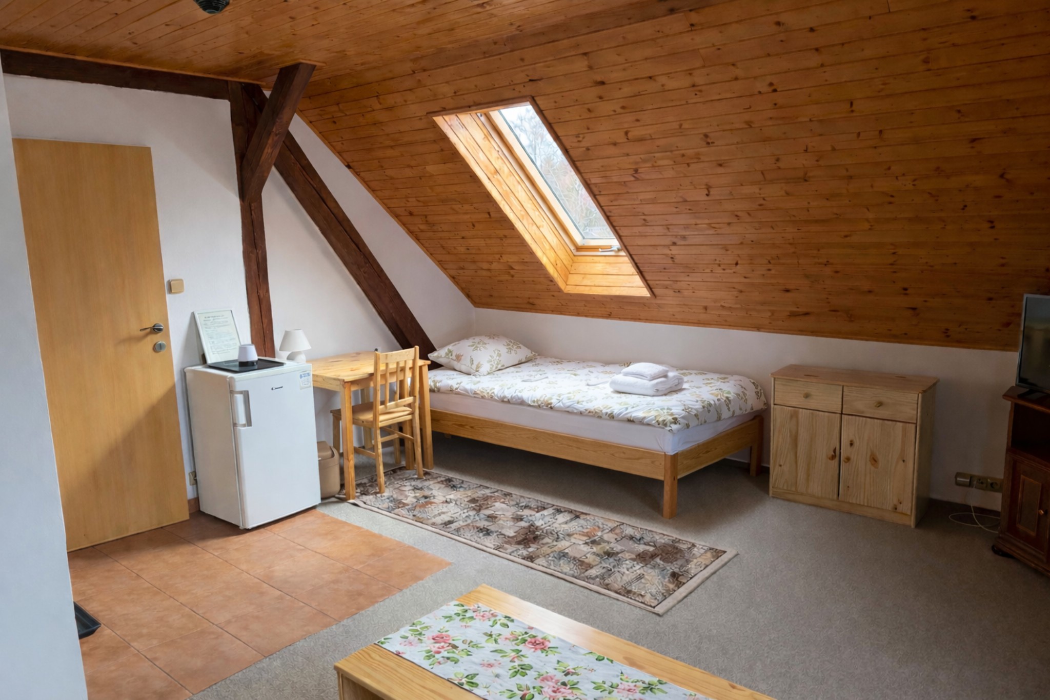 Velkou předností jsou také krásné výhledy. Ze dvou oken se otevírá pohled na historickou náves, zatímco střešní okno směřuje na rybník. Právě spojení pohodlí, prostoru a jedinečných výhledů dělá z tohoto pokoje jedno z nejpříjemnějších míst k ubytování v penzionu.