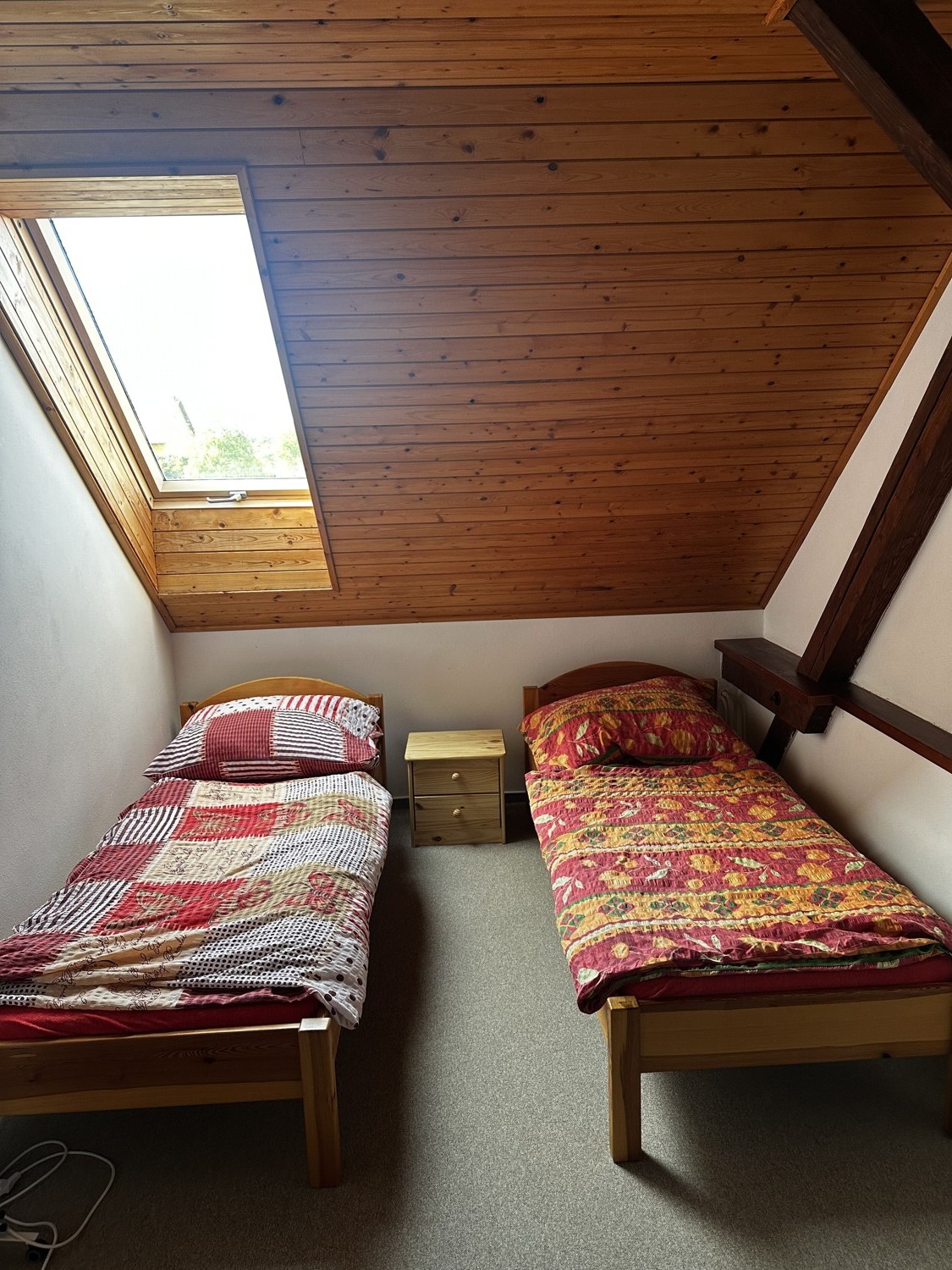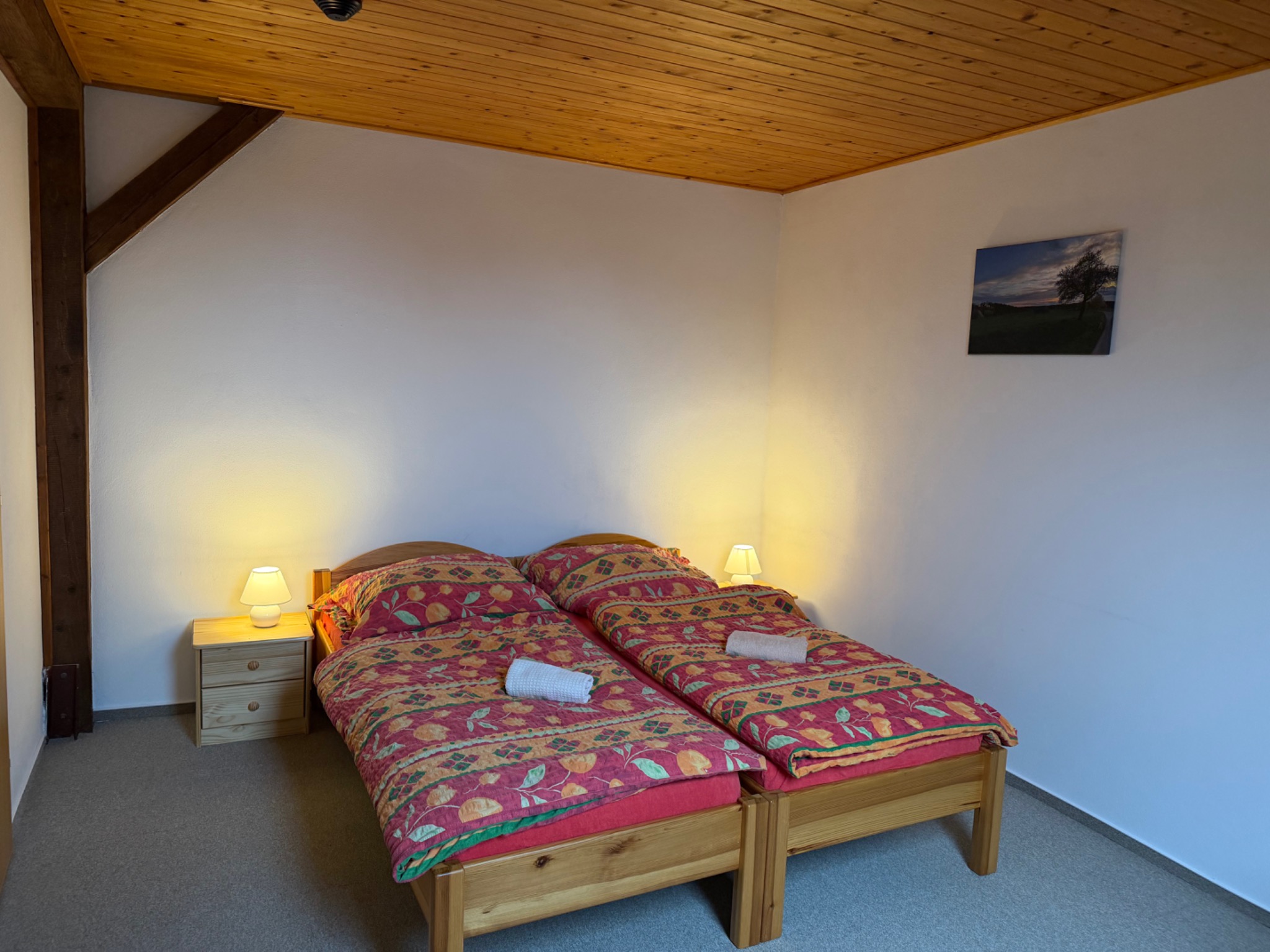 K dispozici je pohodlné manželské dvulůžko, samostatné jednolůžko s možností přistýlky a pokoj tak nabízí variabilní využití podle potřeb hostů. Celý prostor působí klidně, útulně a domácky, takže si zde hosté mohou opravdu odpočinout – ať už přijedou na víkend, dovolenou nebo kratší pobyt mimo každodenní ruch.