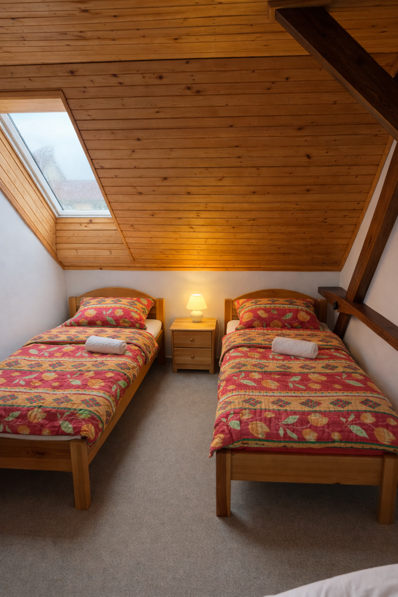 K dispozici je pohodlné manželské dvulůžko, samostatné jednolůžko s možností přistýlky a pokoj tak nabízí variabilní využití podle potřeb hostů. Celý prostor působí klidně, útulně a domácky, takže si zde hosté mohou opravdu odpočinout – ať už přijedou na víkend, dovolenou nebo kratší pobyt mimo každodenní ruch.