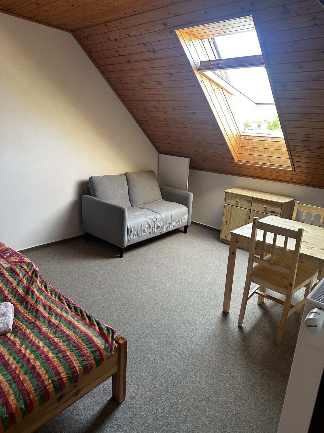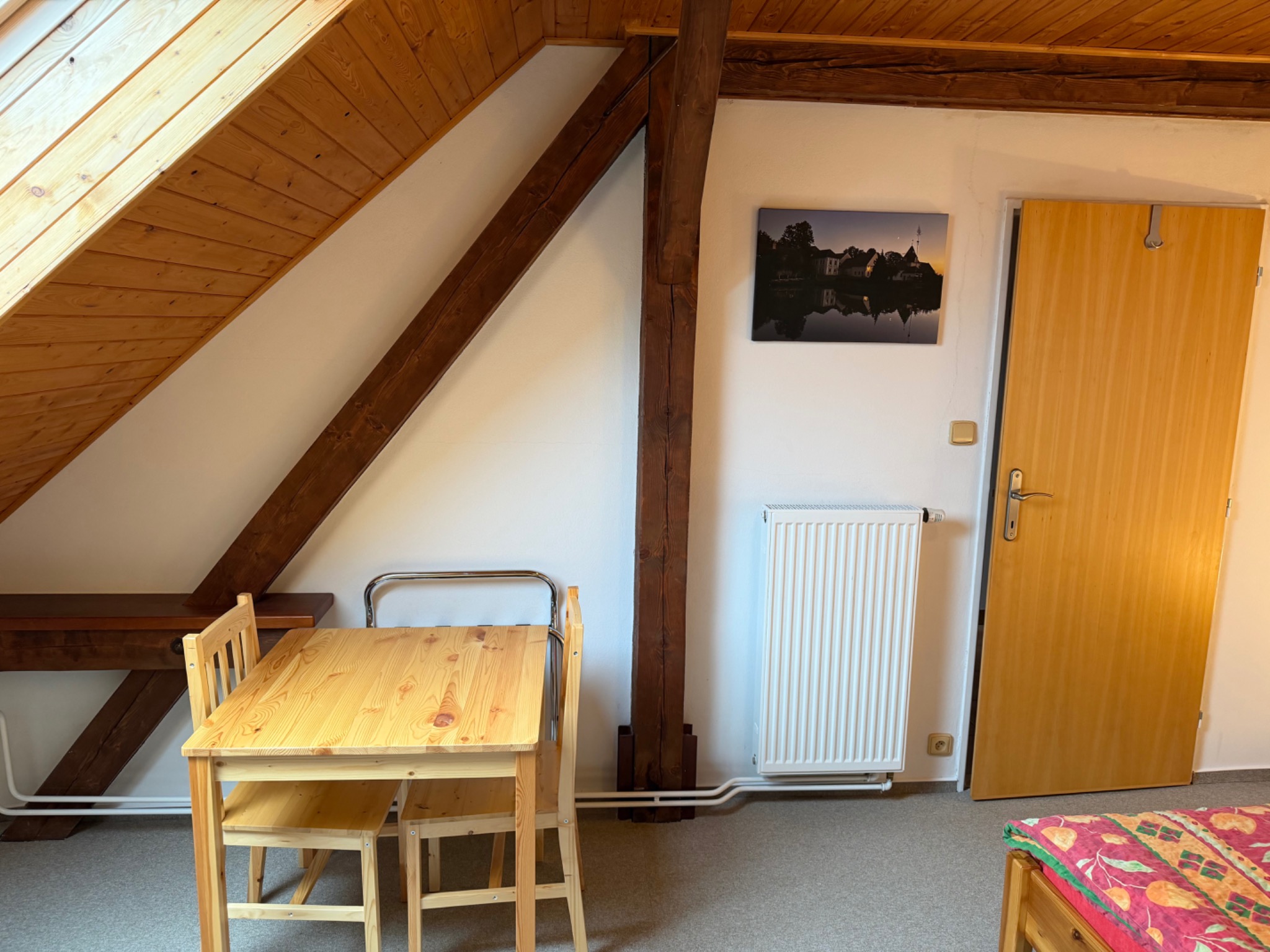Velkou předností jsou také krásné výhledy. Ze dvou oken se otevírá pohled na historickou náves, zatímco střešní okno směřuje na rybník. Právě spojení pohodlí, prostoru a jedinečných výhledů dělá z tohoto pokoje jedno z nejpříjemnějších míst k ubytování v penzionu.